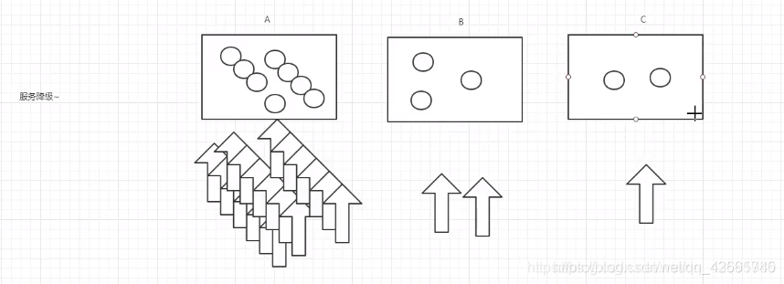 由上图可得,当某一时间内服务 A 的访问量暴增,而 B 和 C 的访问量较少,为了缓解 A 服务的压力,这时候需要 B 和 C 暂时关闭一些服务功能,去承担 A 的部分服务,从而为 A 分担压力,叫做服务降级。