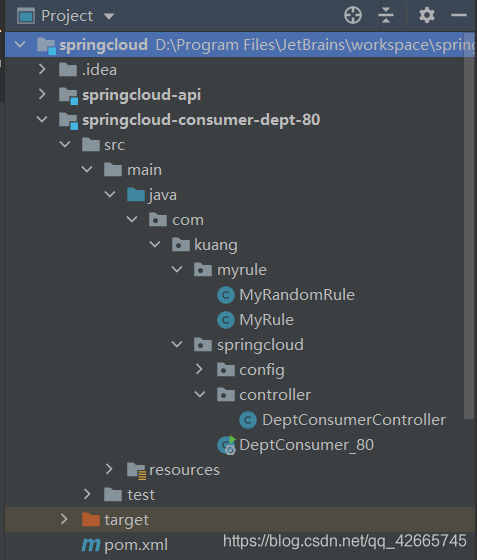 在 myRule 包下自定义一个配置类 MyRule.java,注意:该包不要和主启动类所在的包同级,要跟启动类所在包同级